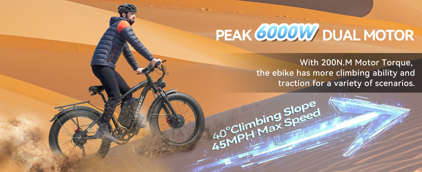 - 【Dual Motor Ebike Unleash Thrilling Speed & Power】Experience heart-pounding acceleration with dual 3000W peak brushless motors delivering 6000W combined output. Conquer 40° inclines effortlessly with 200N·m torque, reaching speeds in 45MPH in PAS Level 5 mode - perfect for adrenaline-fueled adventures or swift urban commutes. Our smart torque algorithm ensures seamless power delivery across all terrains