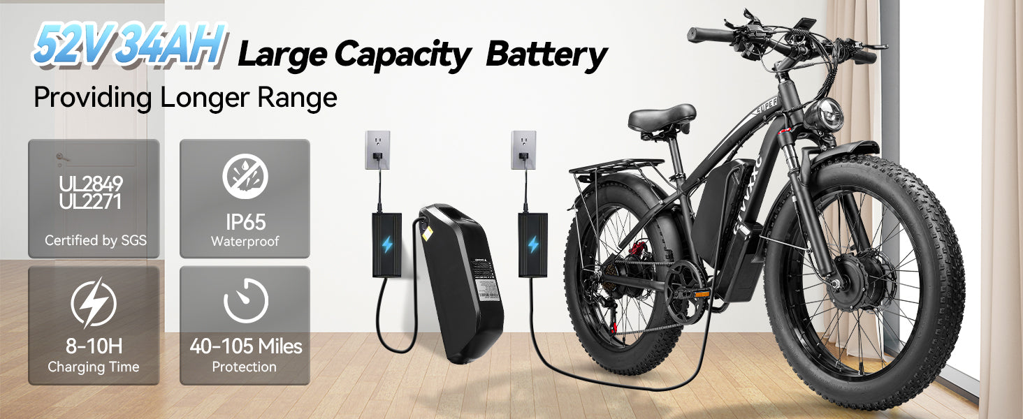 - 【E bikes for Adults Electric Provide Extended-Range 52V 34Ah Powerhouse】Journey 100 miles on a single charge with our upgrade 52V 34Ah Li-ion battery(Based on PAS mode). The IP67-rated removable battery pack features intelligent thermal management, maintaining optimal performance from -4°F to 140°F. Whether you're embarking on long rides or short trips, you'll enjoy the freedom to ride without worrying about running out of power,keeping your adventures uninterrupted