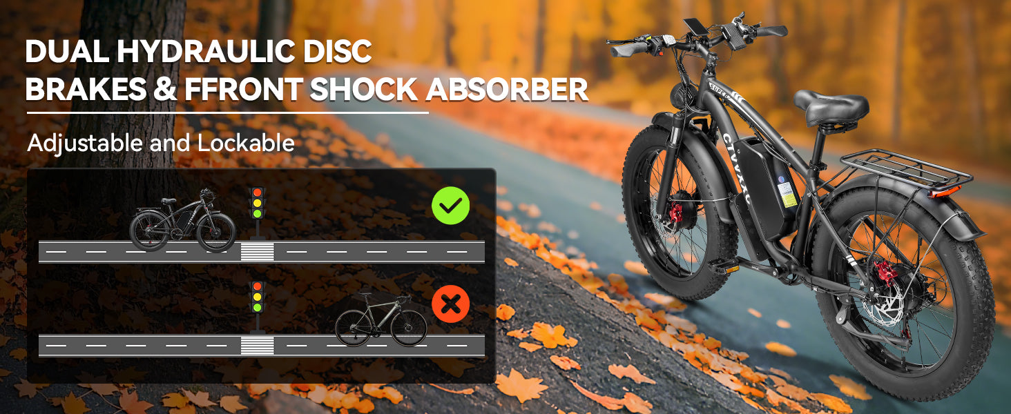 - 【Hydraulic Disc Brakes】The front and rear hydraulic brake system with power-off function offers an easy brake within 2 seconds, which provide more effective braking in rainy weather, heavy off-road, long downhill, high-speed riding and adverse conditions, stop the e-bike quickly and smoothly. The lockable aluminum suspension front fork has a good shock absorption effect, which can offer you safer and comfortable riding experience