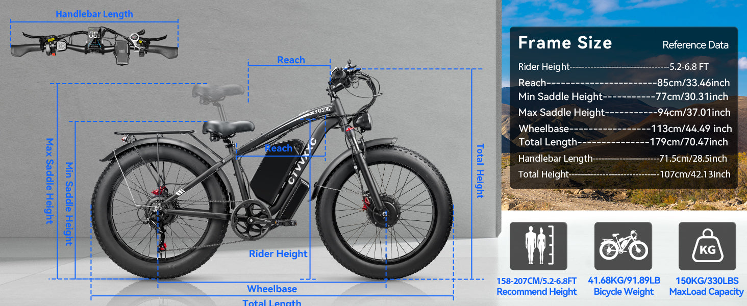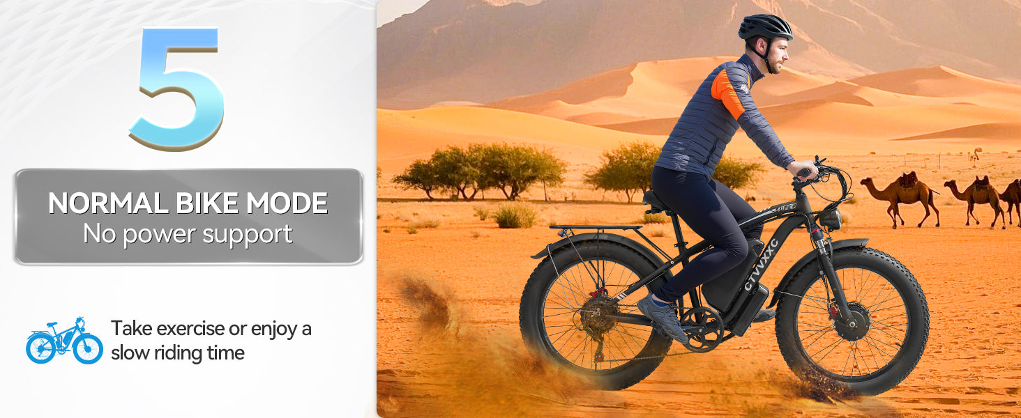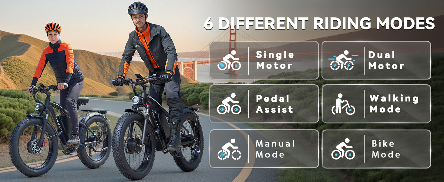 - 【6 Riding Modes】Including pedal assist mode, dual motor pure electric mode, single motor pure electric mode, normal bike mode, cruise control mode, and walking mode. Elevate your off-road adventures with our dual motor electric bike for adults. Unleash the thrill of conquering diverse terrains, from rugged mountain trails to challenging off-road paths. Multiple modes are suitable for different road conditions, making your riding journey more fun
